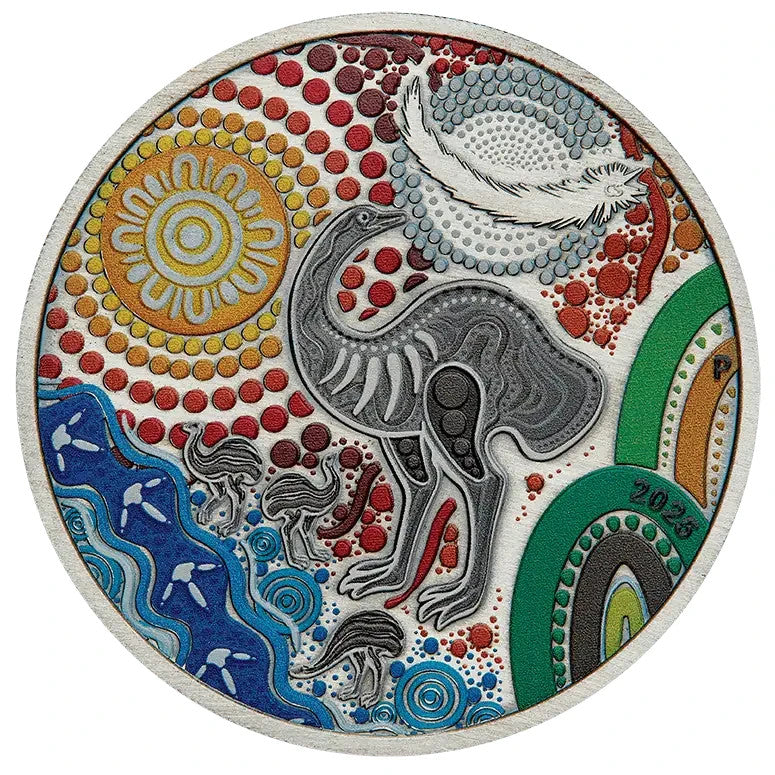 The coin’s reverse showcases a vibrant painting by renowned Aboriginal artist Chern’ee Sutton, a proud Kalkadoon woman. Her colorful design features an emu surrounded by three chicks. Additionally, a large yellow circle symbolizes the sun, while dots of yellow, orange, and red represent its powerful rays.