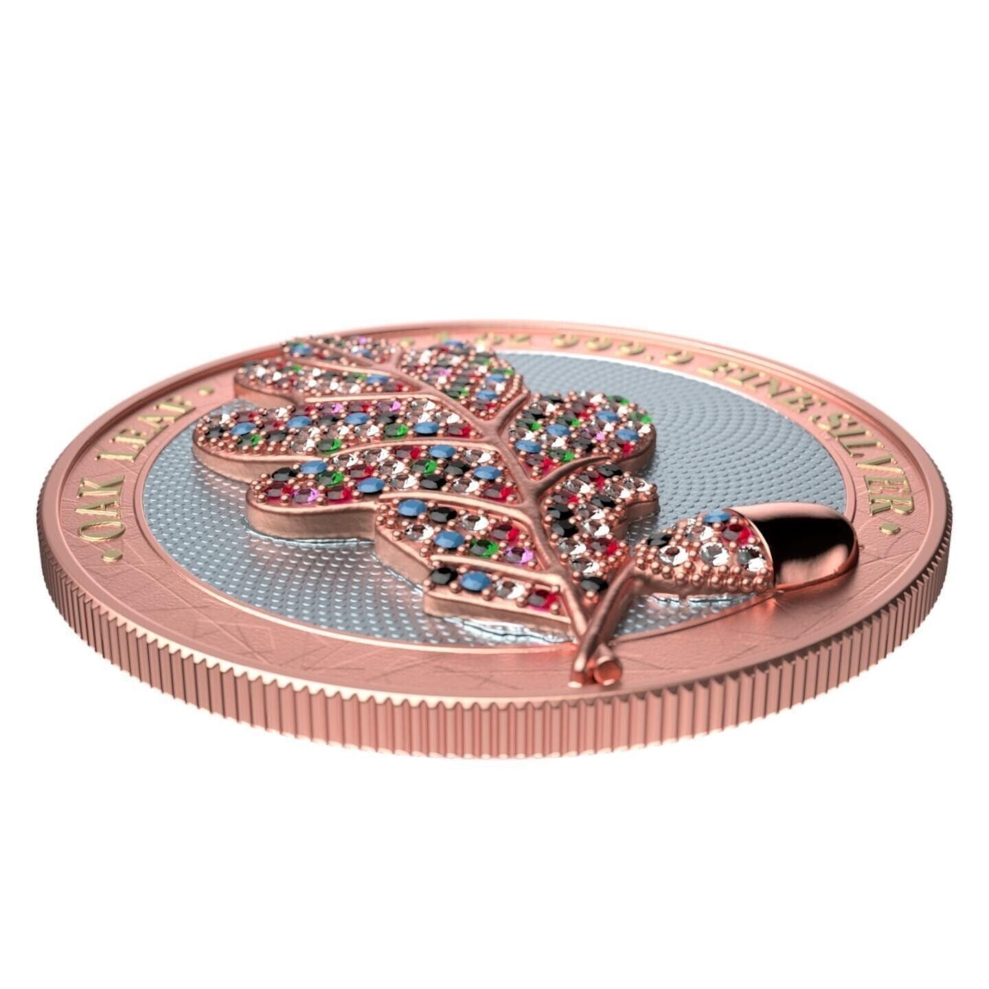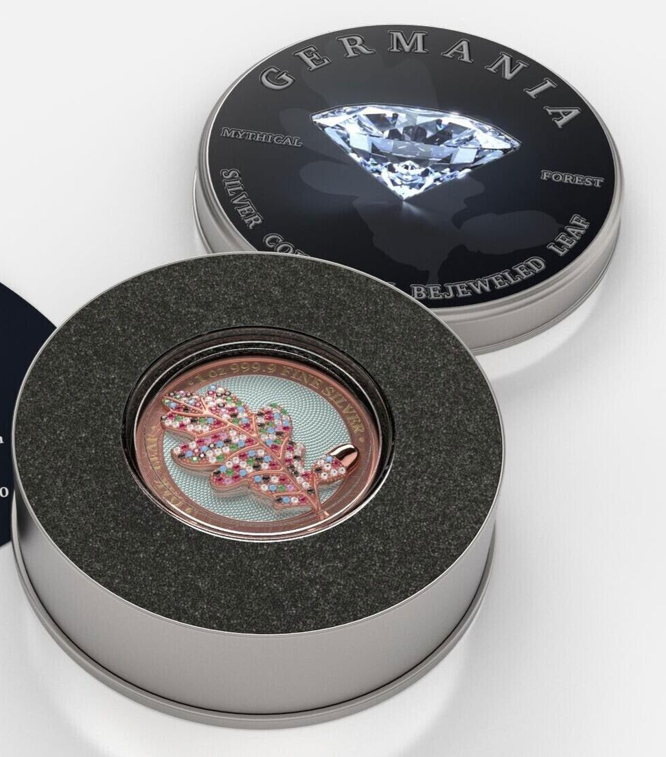 New directly from the Mint Genuine 100% Authentic 1 Oz Silver Coin 2019 5 Mark Germania Bejeweled Oak Leaf Pink Silver Coin. This coin has a 925 Silver Oak Leaf with Swarovski Crystals placed on top of the 999 1 oz silver coin. Unique design and Limited Edition.
