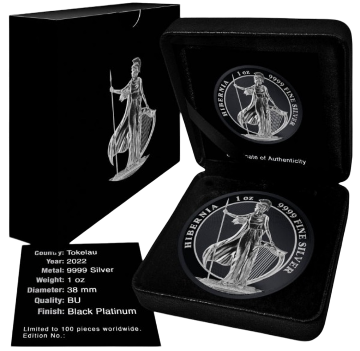 1 Oz Silver Coin 2022 Tokelau Hibernia Black Platinum Edition Mintage 100