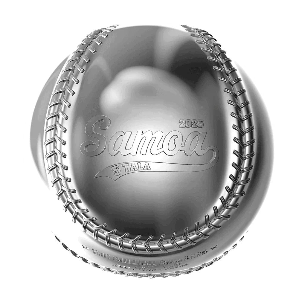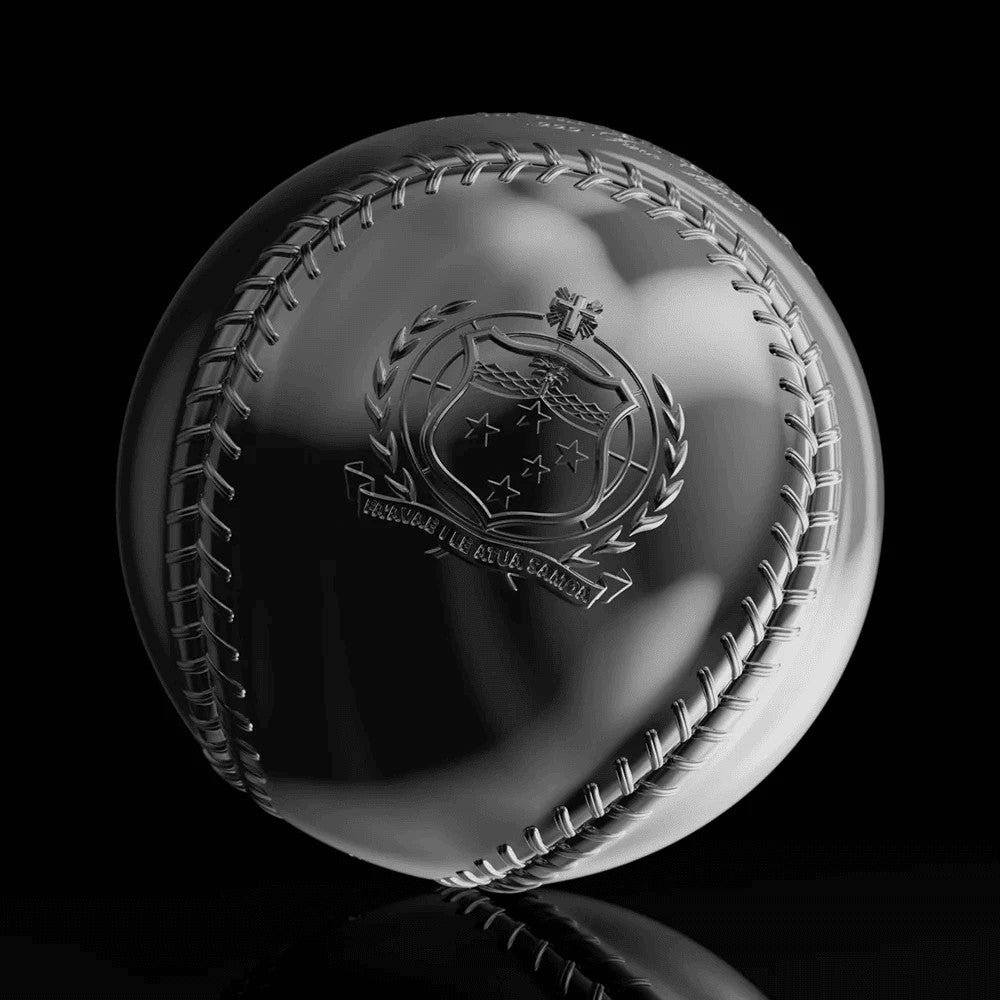 The design mirrors the unmistakable look of a real baseball, complete with its iconic two-panel construction and detailed stitching.. Featured on the ball is a stylized baseball-themed logo of Samoa, along with the official coat of arms and a fictional team name we created: The Bullion Bombers. A nod to both precious metal collectors and baseball fans—join the team now!