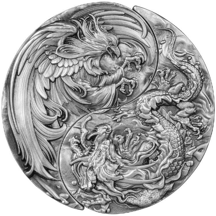 2 X 1 Oz Silver + 4.5 oz Copper Coin 2023 T'Chad Yin Yang Dragon & Phoenix Antique