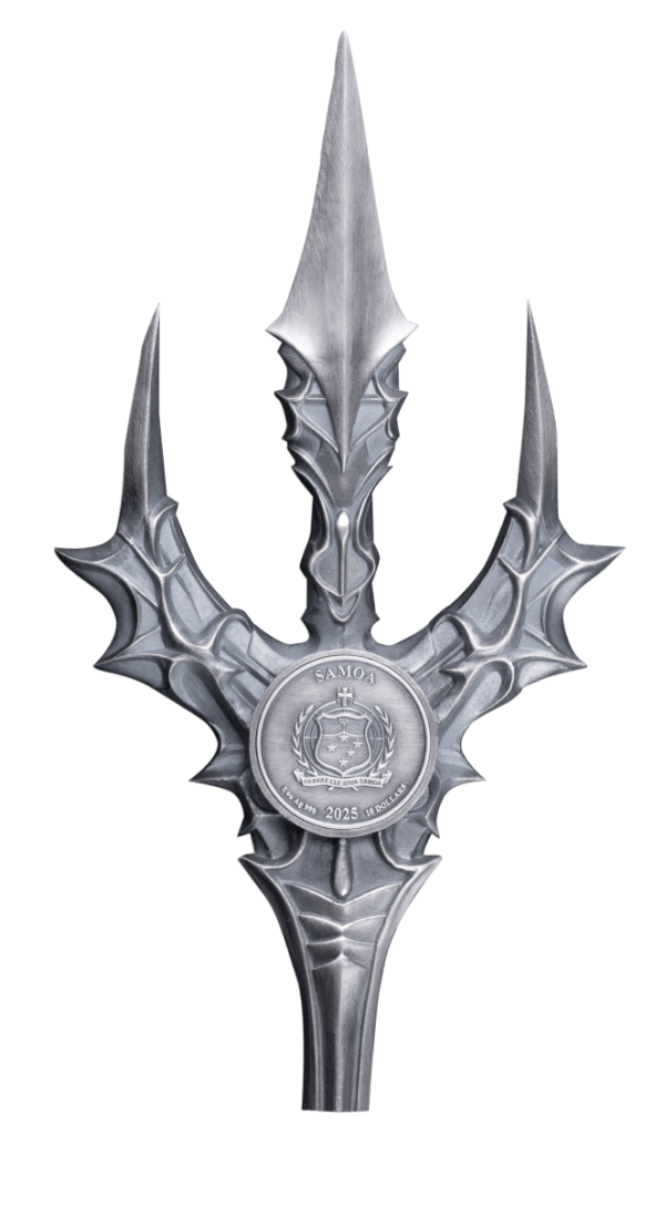 • 5 Oz Silver Coin 2025 Samoa Neptune's Trident Shaped Antiqued Coin Mintage 399