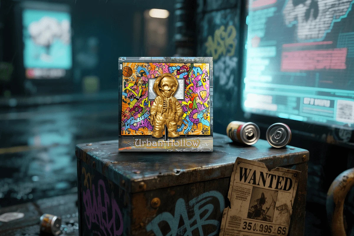 Step into the future of numismatics with the 2025 Cameroon Urban Hollow, the inaugural release in the groundbreaking Hollow Series. This extraordinary coin is a fusion of modern design and traditional craftsmanship, meticulously struck from 2 oz of .999 fine silver and finished with a stunning gold gilding that accentuates its bold, high-relief details.