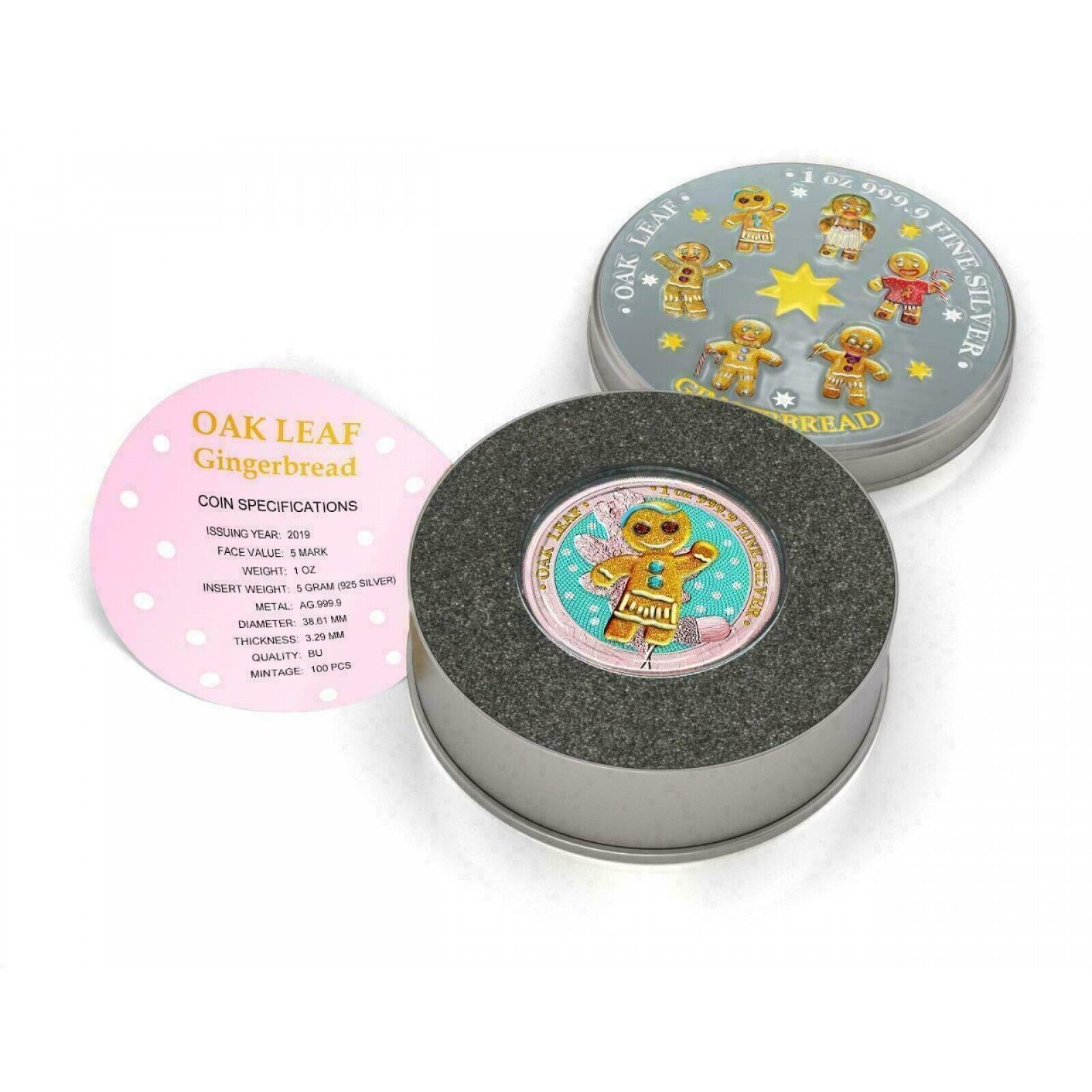 Новинка прямо с монетного двора. Подлинная 100% подлинная серебряная монета весом 1 унция 2019 года 5 марок из дубового листа Германии, украшенная драгоценностями Пряничный человечек-девушка . Уникальный дизайн и ограниченная серия.