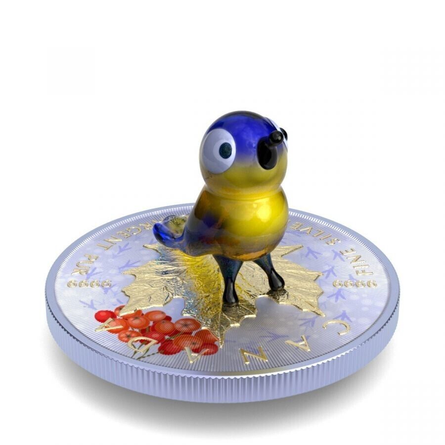 Серебряная монета 1 унция 2022 года 5 долларов Канада, серия «Кленовый лист» из муранского стекла - Синица-птица