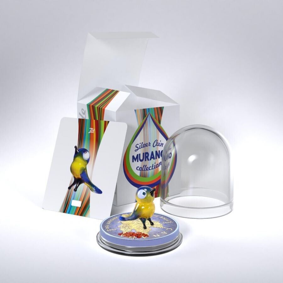 На этой монете фигурка из муранского стекла помещена поверх серебряной монеты 999 пробы весом в 1 унцию. Уникальный дизайн и ограниченная серия.