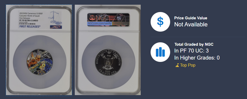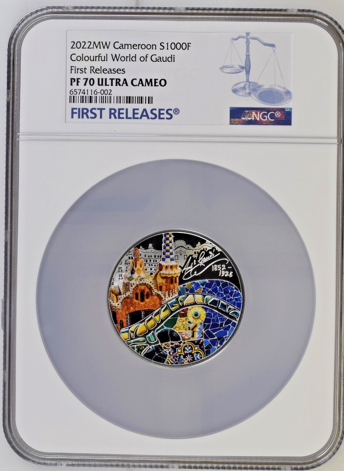 • 1 oz Silver Coin 2022 Cameroon Colourful World of Gaudi NGC PF 70 UCAM FR TOP 3!
