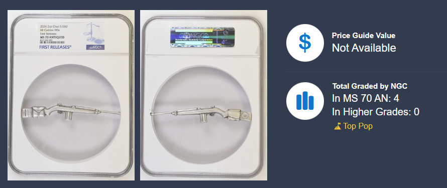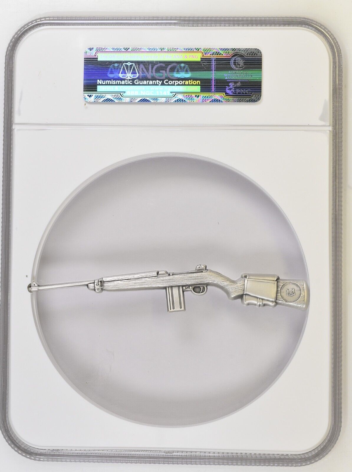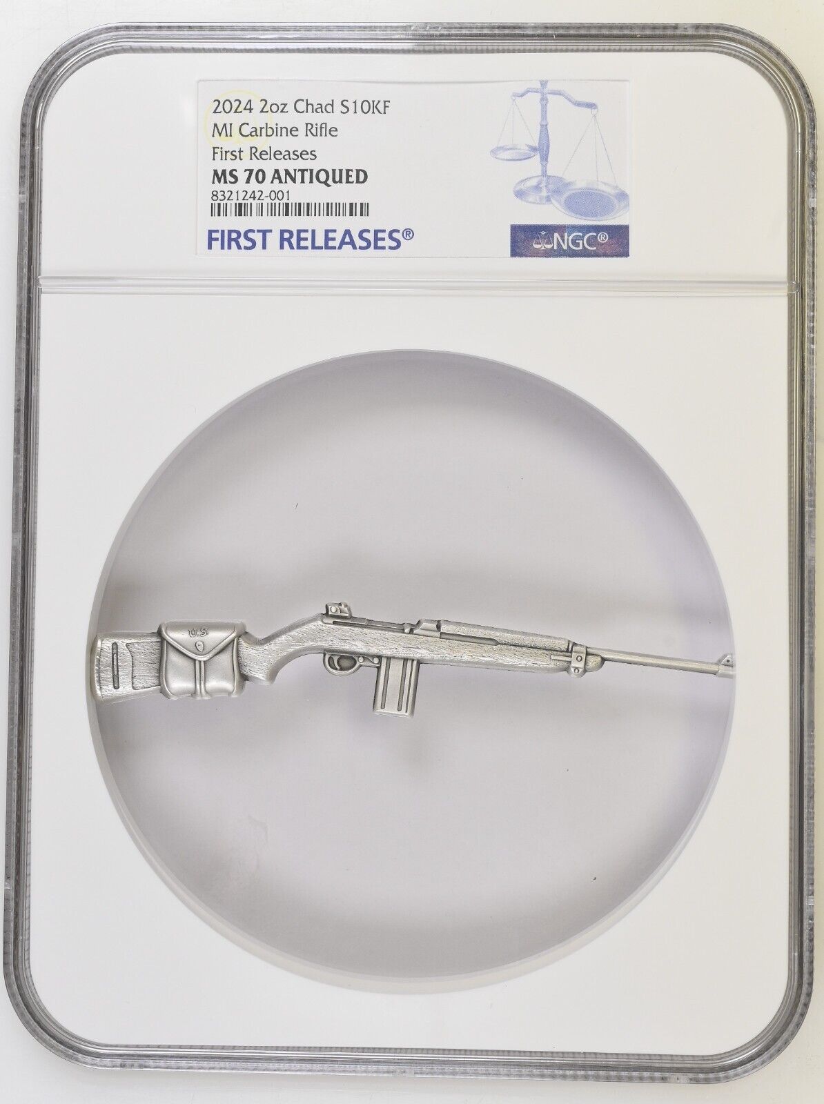 • 2 Oz Silver Coin 2024 Chad Carbine Rifle NGC MS 70 Antiqued FR Top pop of 4!
