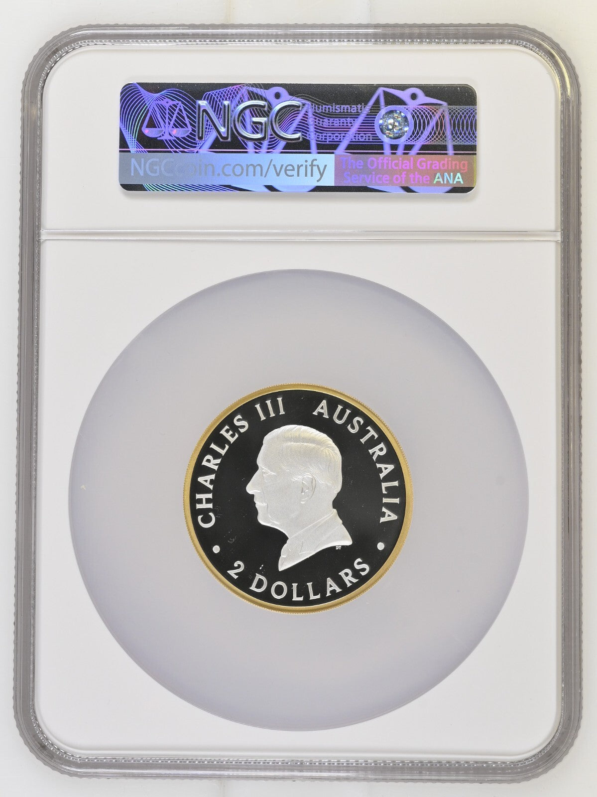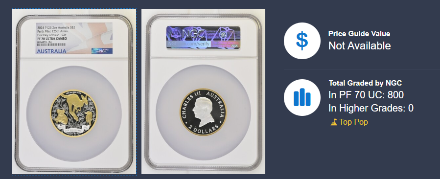 • PERFECT PROOF CONDITION – Your 2024 Australia $2 Two-Ounce Silver Perth Mint 125th Anniversary Gold-Gilded Coin has been graded by the Numismatic Guaranty Company (NGC) in perfect Proof-70 Ultra Cameo (PF70UC) condition.