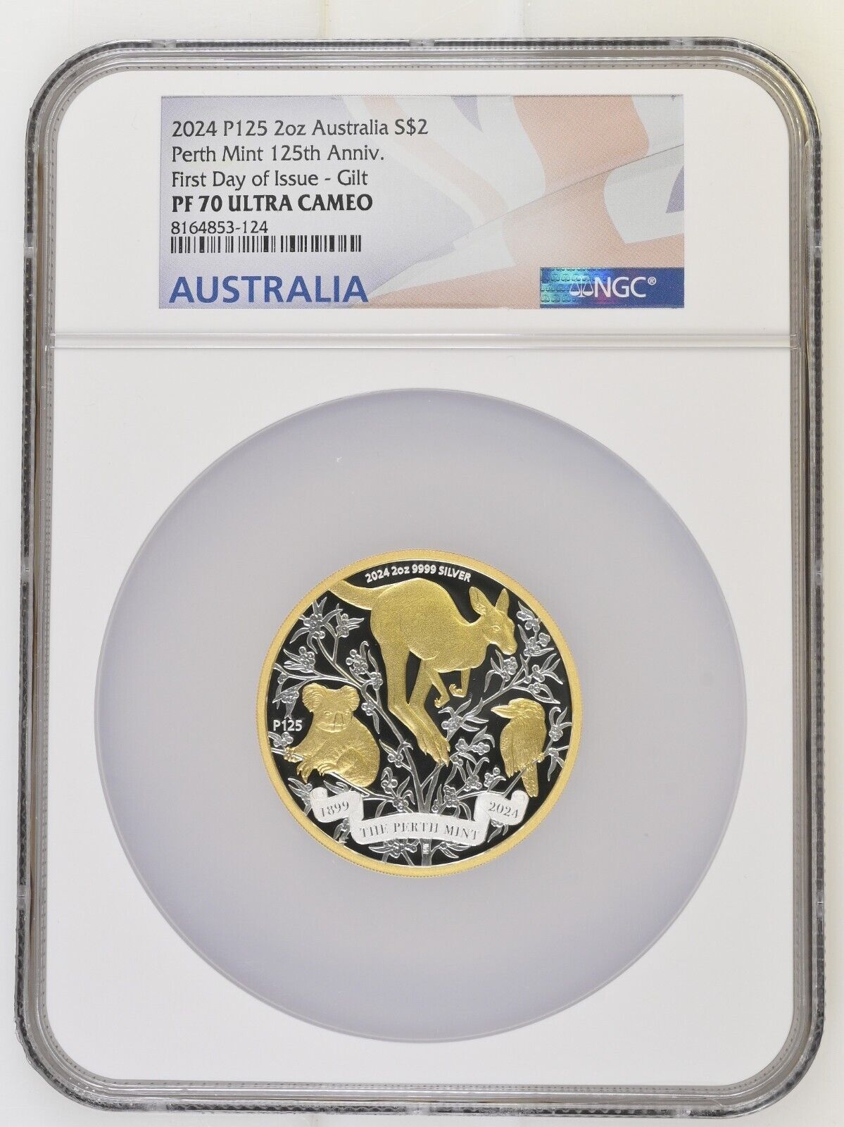 • 2 Oz Silver Coin 2024P Australia $2 Perth Mint 125th Ann Gilt Proof PF70 UC FDI