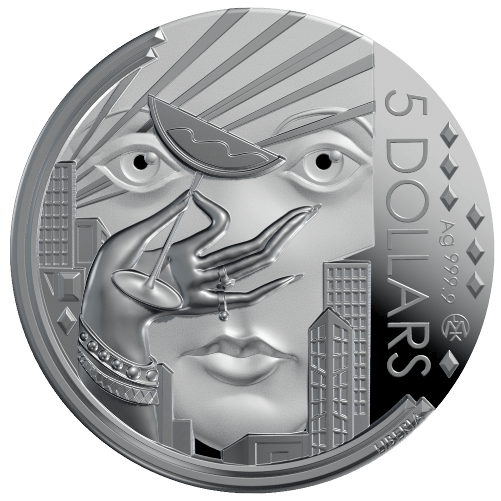 • 2 Oz Silver Coin 2025 Liberia $5 Great Gatsby 100 Anniversary w/Crystal Inserts