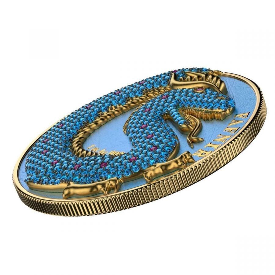 Новинка непосредственно из набора подлинных серебряных монет 2020 года весом 2 х 1 унцию 5 марок Фафнира — зеленый синий, без 4 кристаллов в большие точки. Уникальный дизайн и ограниченная серия.