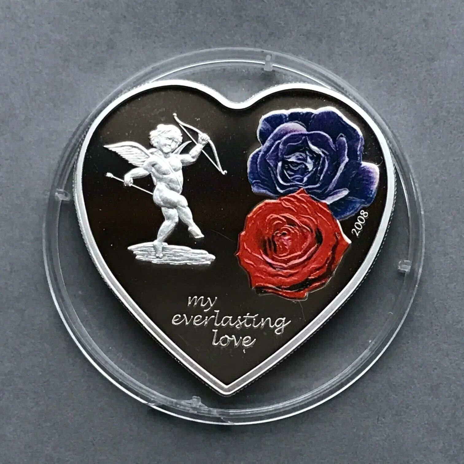 25g Silver Coin 2008 Cook Islands $5 My Everlasting Love Heart Shaped Cupid and Two Roses.