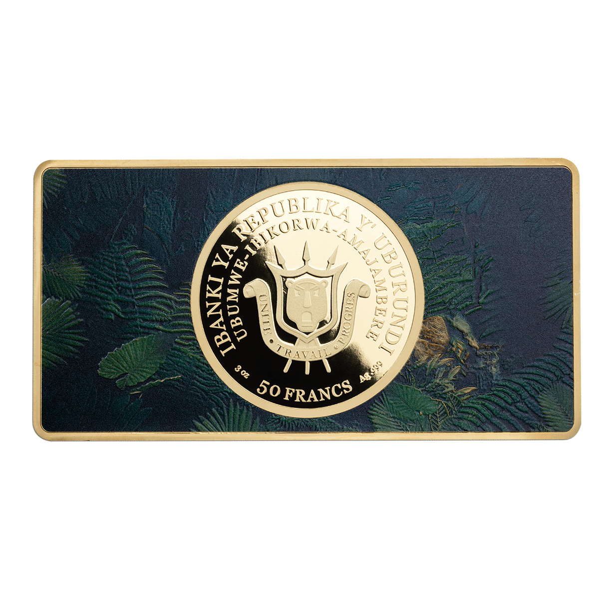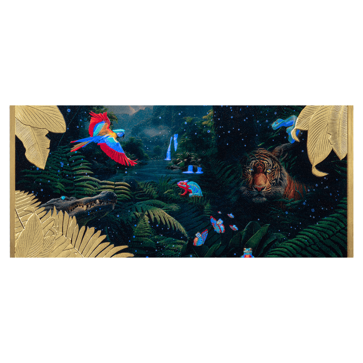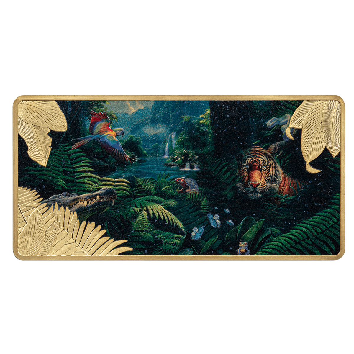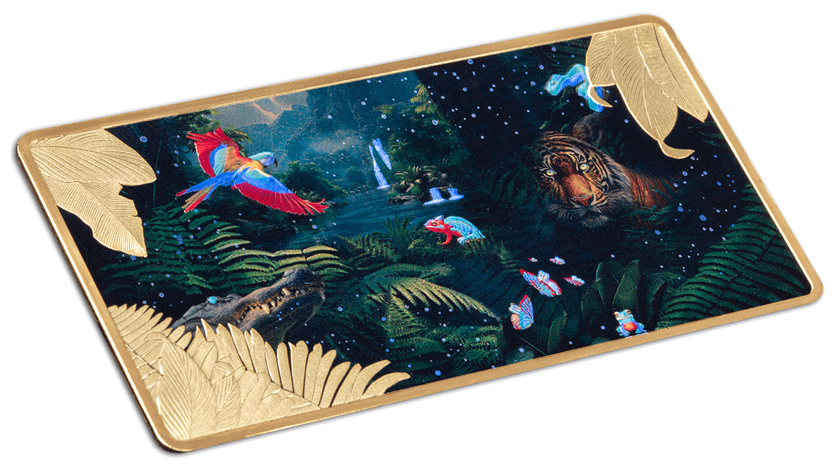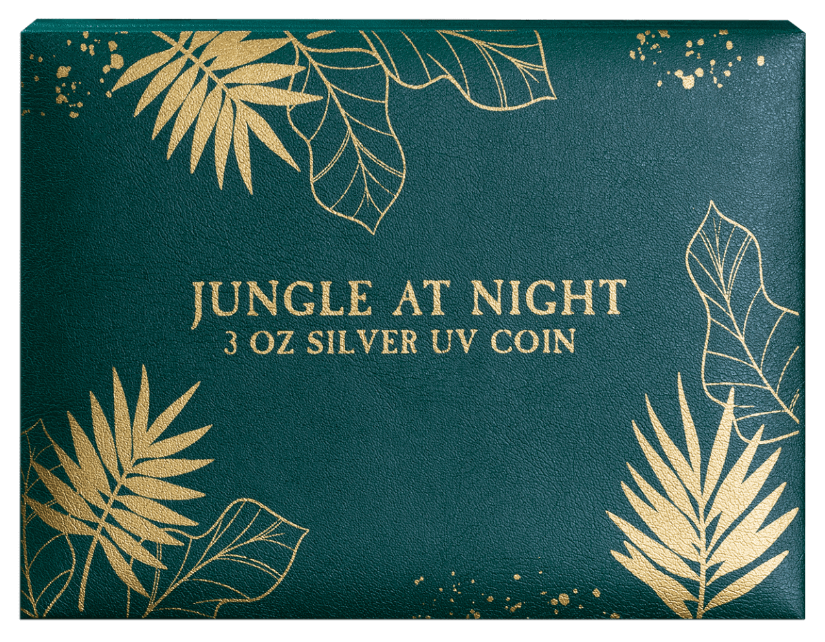 This exclusive 3 oz pure Silver coin dazzles with luxurious 24k Gold plating and an intricately designed jungle motif. Using state-of-the-art UV printing technology, every detail comes to life with a visually striking finish.