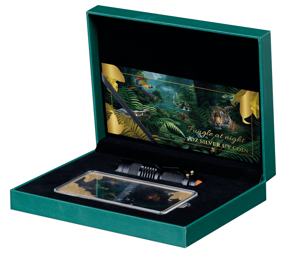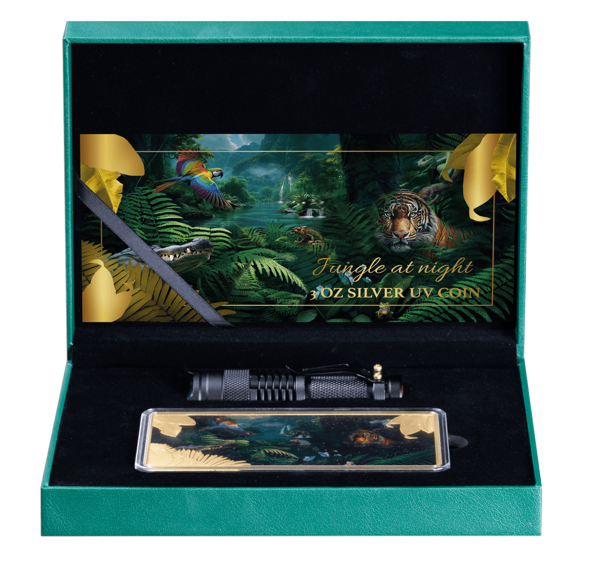 A special UV torch is included to reveal the coin’s vivid colors and bring the jungle to life like never before!